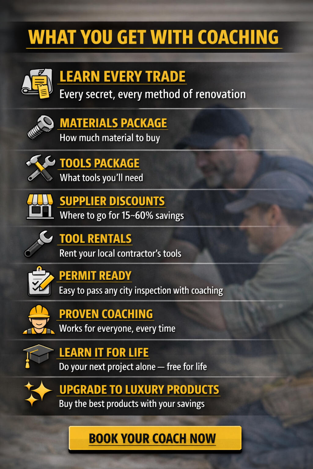 After 17 years in construction, I trained employees with zero experience - many went on to run their own companies. That's when i realized homeowners can learn the same way.I have built small homes from start to finish with a small crew - and worked on $2M home builds with full subcontractor team.Now I guide homeowners through their own renovations - step by step as they need it.